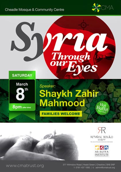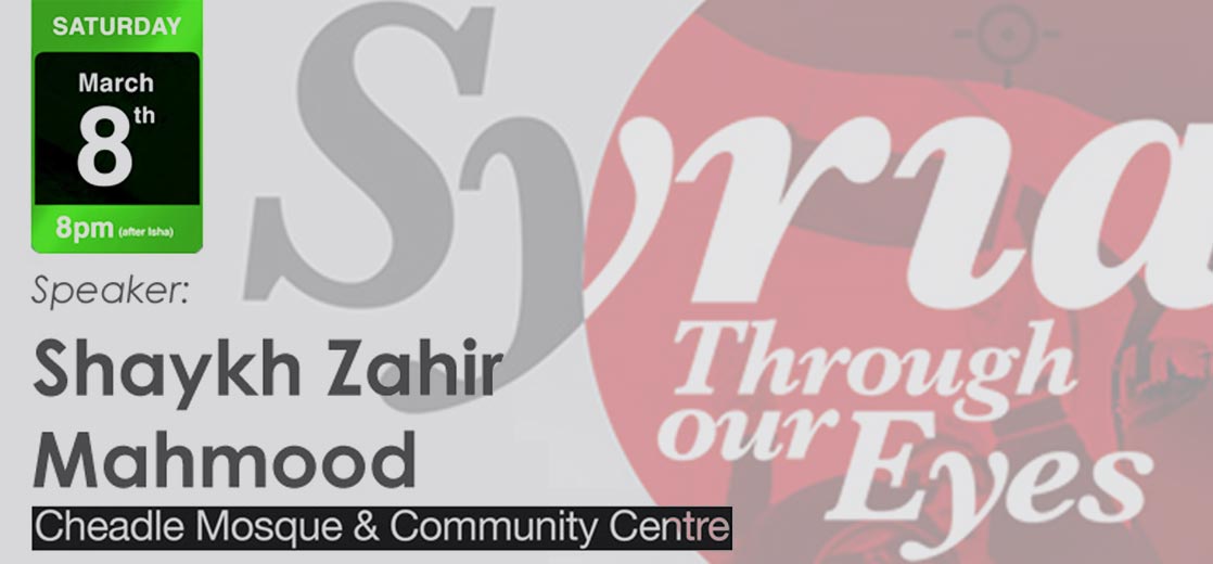 Shaykh Zahir Mahmood will be delivering a special guest talk on the history and situation in Syria.... Sh Zahir is a powerful speaker - this event is not to be missed. Families welcome and Hot Buffet provided. Event Date: Saturday, 8 March, 2014Venue: Cheadle MosqueManchester