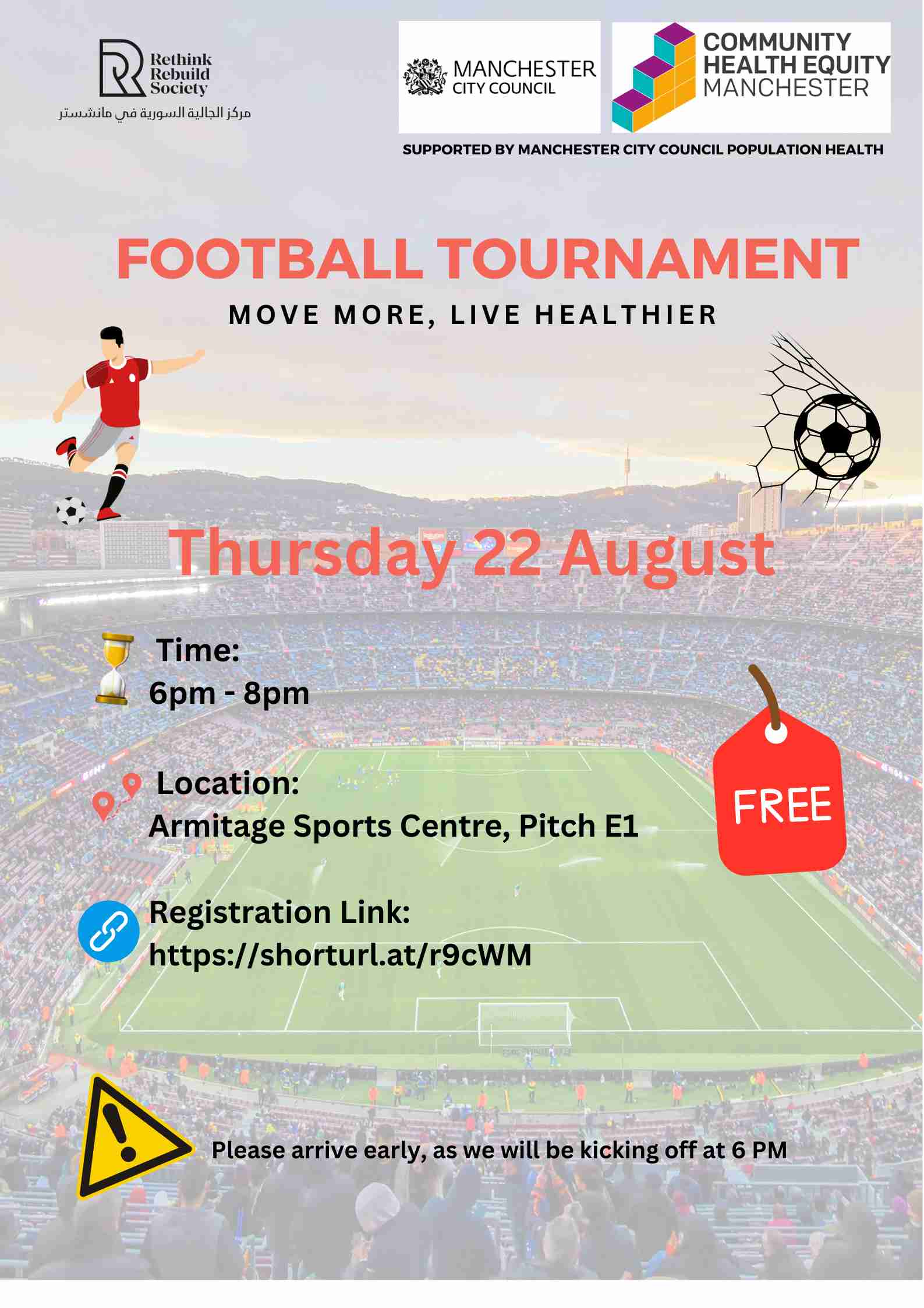من وحي أجواء الصيف الجميلة، يدعوكم مركز الجالية السورية في مانشستر (جمعية فكر وبناء) للمشاركة في لعبة كرة قدم لمرة واحدة