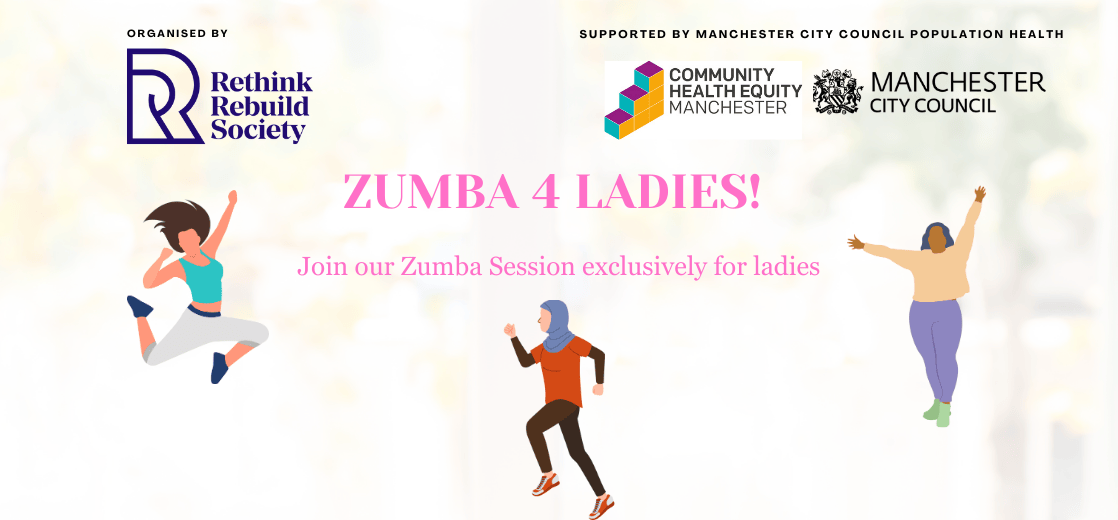 Join us for one free all ladies Zumba Session organised by Rethink Rebuild Society and supported by the Manchester City Council Population Health (CHEM).