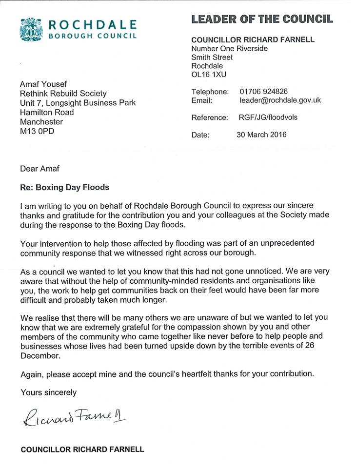 Rochdale Council sent a letter of thanks on 30 March to our Refugee Support Coordinator Amaf Yousef for the help that Syrian refugees provided in the flood efforts in December. We are very humbled by this acknowledgement and look forward to further engagements with the community.