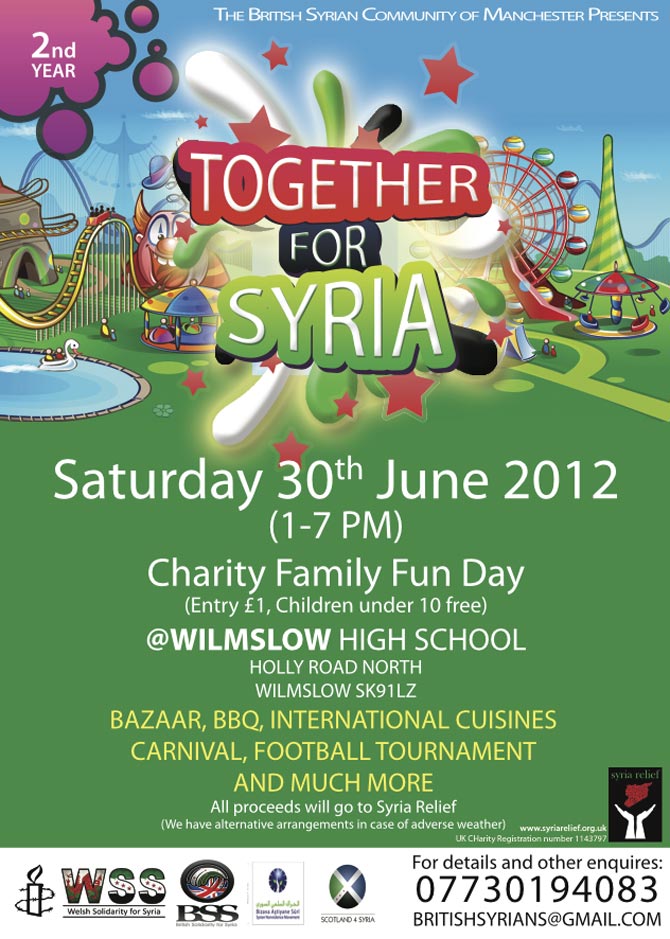 We have recruited the help of over a hundred volunteers to help us ensure that this will be a wonderful day, that we will all remember for a long time to come. An attendance target of 6,000 is, of course, an ambitious one, but with your help and support, we can certainly achieve it. The Syrian Community in Manchester has always demonstrated great enthusiasm and eagerness to support similar events across the UK: We have hired buses and came in large numbers to participate and provide material and logistical support to many charity and awareness events all over the UK throughout the past 15 months.
